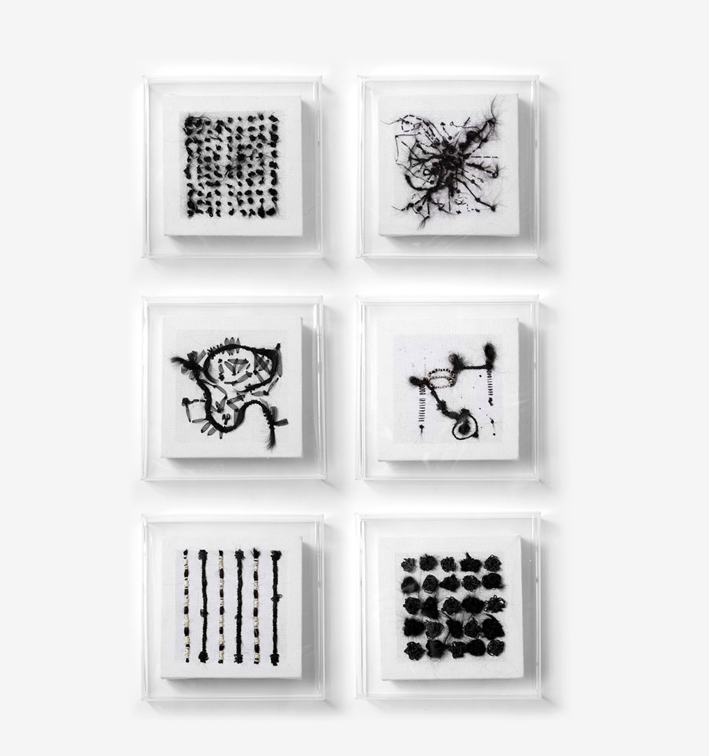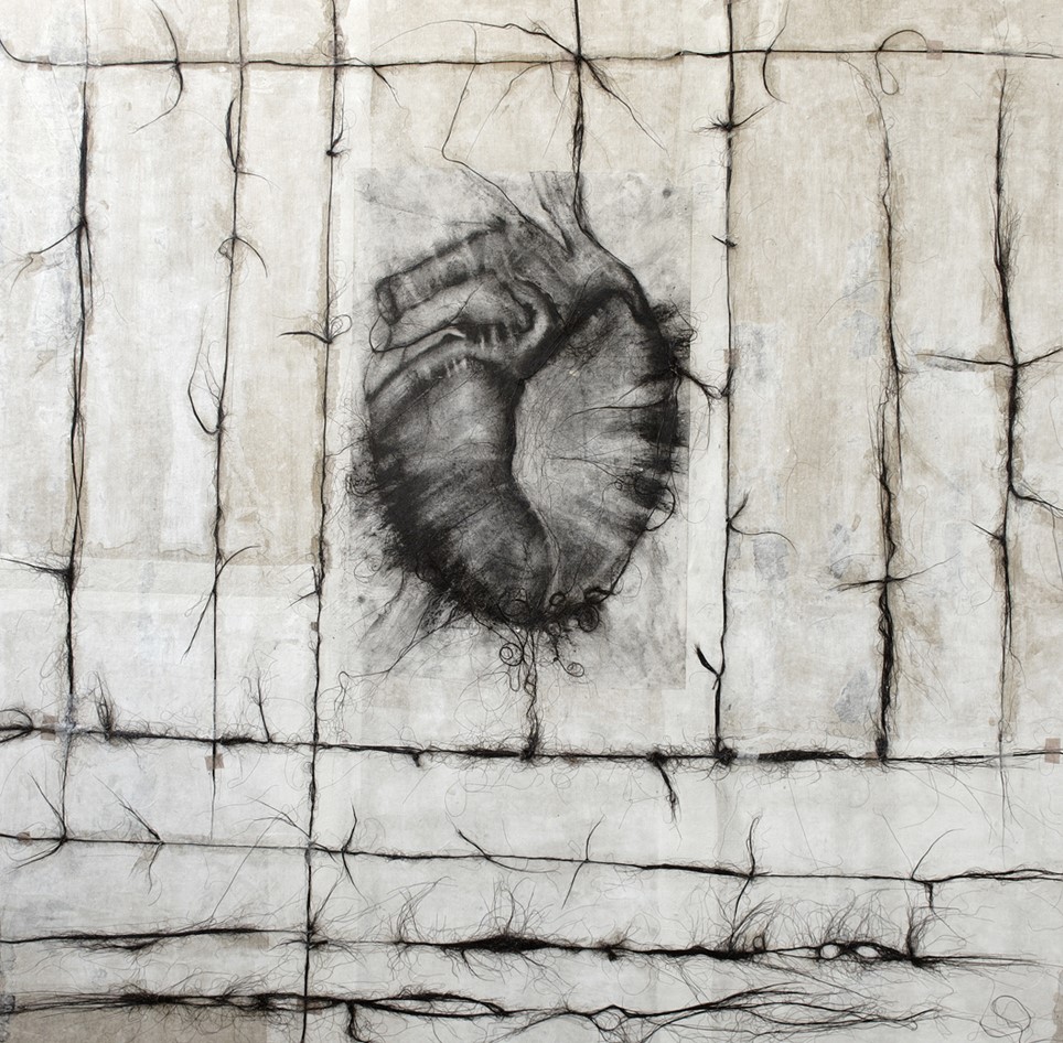 - Fósil | Cabello, Tinta china sobre papel/madera | 1×1 mts